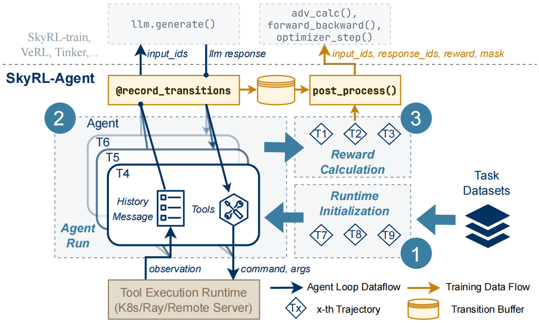 SKYRL-AGENT 旨在促进跨多种智能体任务的长时域、多轮、多工具智能体的端到端强化学习训练。