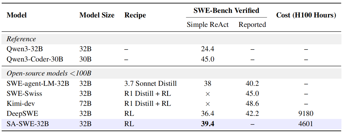 这些优化措施共同使 SA-SWE-32B 在 SWE-Bench Verified 上达到了 39.4% 的 Pass@1,同时相比达到类似性能的先前模型,训练成本降低了 2 倍以上。