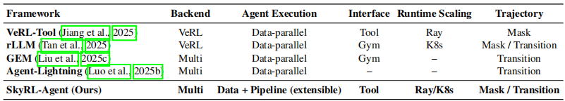 Training Frameworks for LLM Agents. 现有的智能体训练框架,如 VeRL-Tool、rLLM、GEM 和 Agent-Lightning,已经推进了 LLM 智能体的大规模强化学习训练,但仍受限于朴素的异步批处理(即数据并行)执行。SKYRL-AGENT 支持多维度的灵活 rollout 调度(如数据并行 + 流水线并行)。除了执行效率之外,SKYRL-AGENT 将无状态工具(如 Python 解释器)、环境修改操作(如文件编辑器)和智能体状态修改操作(如摘要)统一在单一工具中,而不像以 Gym 为中心的循环,后者在 env.step 之外通过临时实现管理智能体状态。如表 1 所总结,Agent-Lightning 作为训练后端与 LangChain 和 AutoGen 等工作流框架之间的中间层,但缺乏对用户自定义工具和新任务集成的原生支持。rLLM 和 VeRL-Tool 提供更强的可扩展性,但它们绑定到 VeRL 后端,且 VeRL-Tool 基于掩码的轨迹构建限制了其在多智能体系统或记忆智能体等场景中的适用性。
