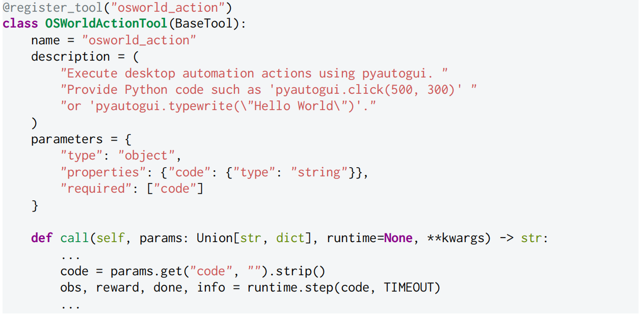 在 SKYRL-AGENT 中,智能体纯粹通过 OpenAI 风格的函数调用来行动。每个工具实现自己的执行逻辑并指定其运行时。现有的 Gym 风格环境可以通过将其 step() 包装为工具来集成,例如,Listing 1 展示了计算机使用智能体的工具实现。