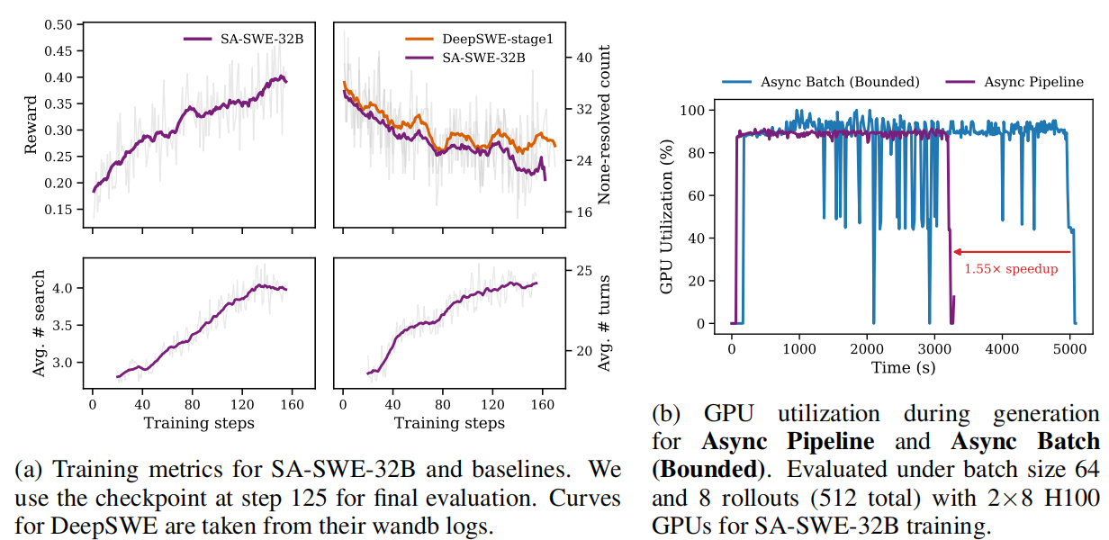 利用 SKYRL-AGENT,我们训练了 SA-SWE-32B,这是一个从 Qwen3-32B(24.4% Pass@1)出发、纯粹通过强化学习训练的软件工程智能体。我们引入了两个关键组件:一个优化的异步流水线调度器[an optimized asynchronous pipeline dispatcher],相比朴素的异步批处理[naive asynchronous batching]实现了 1.55 倍的加速;以及一个工具增强的训练方案,利用基于 AST 的搜索工具[AST-based search tool]来促进代码导航、提升 rollout 的 Pass@K 指标并改善训练效率。