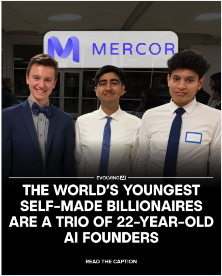 AI 招聘初创公司 Mercor 的三位创始人:Brendan Foody, Adarsh Hiremath 和 Surya Midha,在今年10月公司估值达到 100亿美元后,正式成为史上最年轻的白手起家亿万富翁。