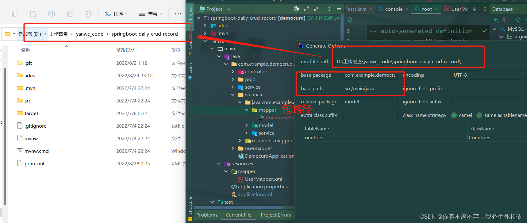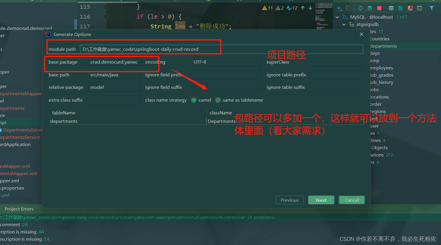 生成的时候可以通过修改选项,比如修改基础包路径、实体类包路径等; 默认是这样的