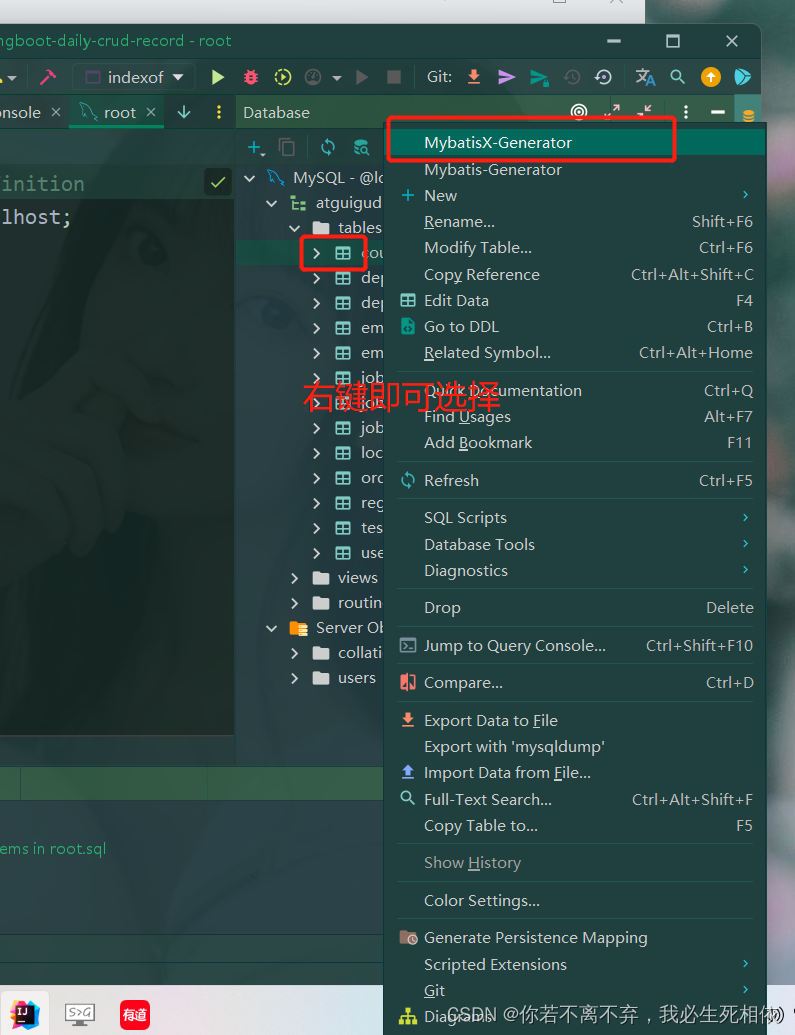 选中表以后右键可以直接生成对应表的CRUD代码,当然你也可以多选,支持一次性生成多表;