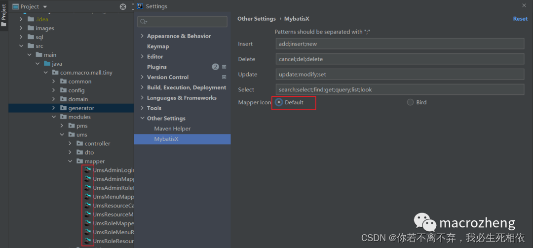 如果你不想Mapper接口和mapper.xml文件都变成小鸟图标的话,可以做在MyBatisX的设置中进行修改。