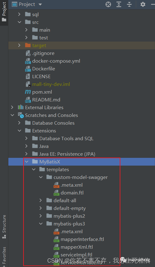 MyBatisX也提供了生成带Swagger注解的实体类模板,但是有点复杂不太符合我的要求,我们可以修改下生成模板,生成模板都在extensions->MyBaitsX目录下;