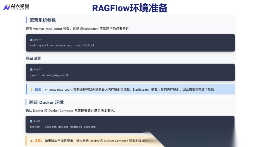 git clone https://github.com/infiniflow/ragflow.gitcd ragflow/docker - 内核参数配置:在启动服务前,必须调整主机系统的内核参数,以满足 Elasticsearch 的要求。```plaintext