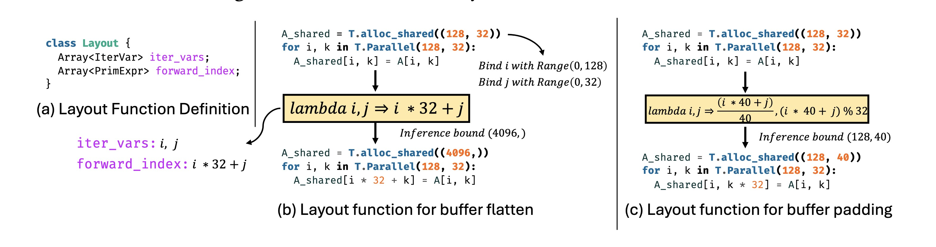 图5(a)展示了TileLang中布局的定义。其核心组件包括iter_vars(可选地携带范围信息)以及一组基于这些迭代变量计算内存位置的forward_index表达式。这些表达式共同定义了一个代数函数𝑓: K𝑛 → K𝑚。如图5(b)所示,这允许表达一个从2D到1D的布局转换。给定缓冲区的形状,iter_vars被绑定到特定区域,生成的表达式被传递给算术分析器以确定符号或常量边界。这些边界用于推断转换后缓冲区的形状,并相应调整缓冲区访问索引。