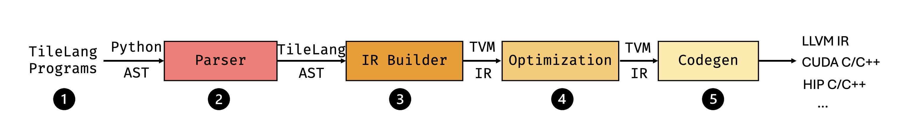 为提升 TileLang 的易用性,我们在 Python 中实现了前端语言,支持灵活的编程风格且仅需最少的类型标注。此外,我们为 TileLang 设计了一个编译器,可将用户定义的程序转换为高度优化的底层代码,以在现代硬件上高效执行。该编译器自动化关键优化,减少了性能调优所需的手动工作。