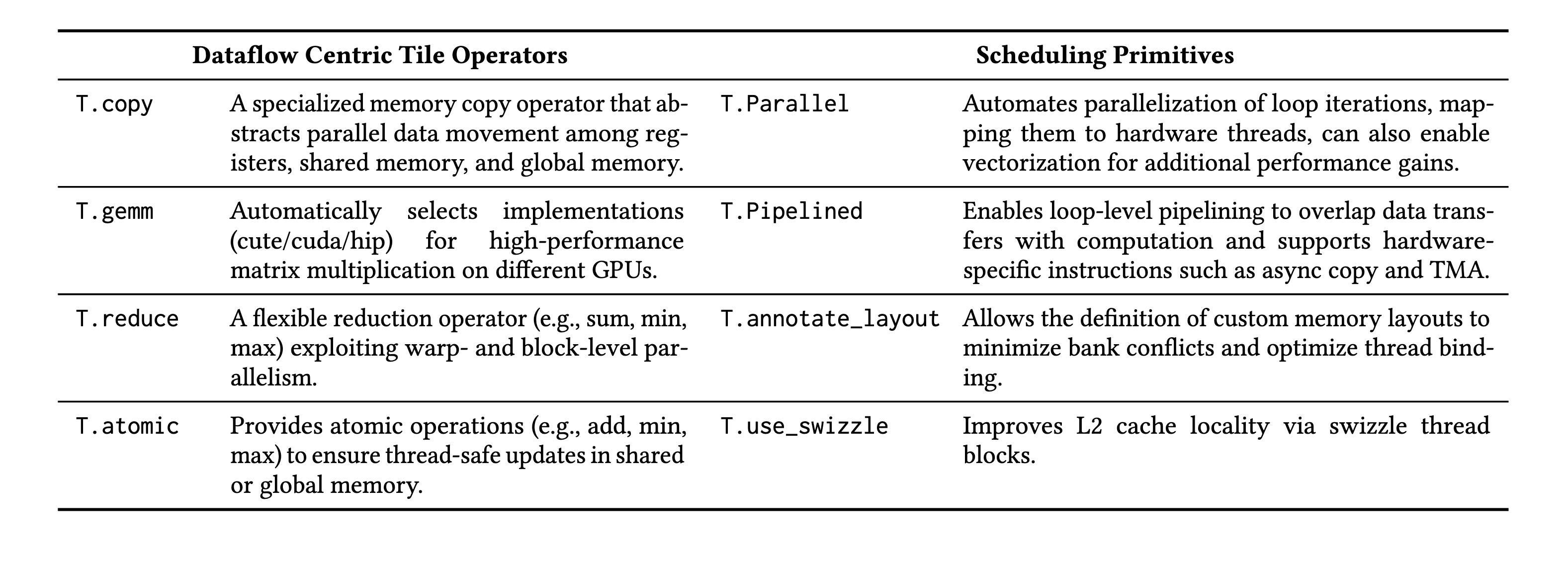 Table 1. A partial list of the dataflow operators and scheduling primitives supported by TileLang.