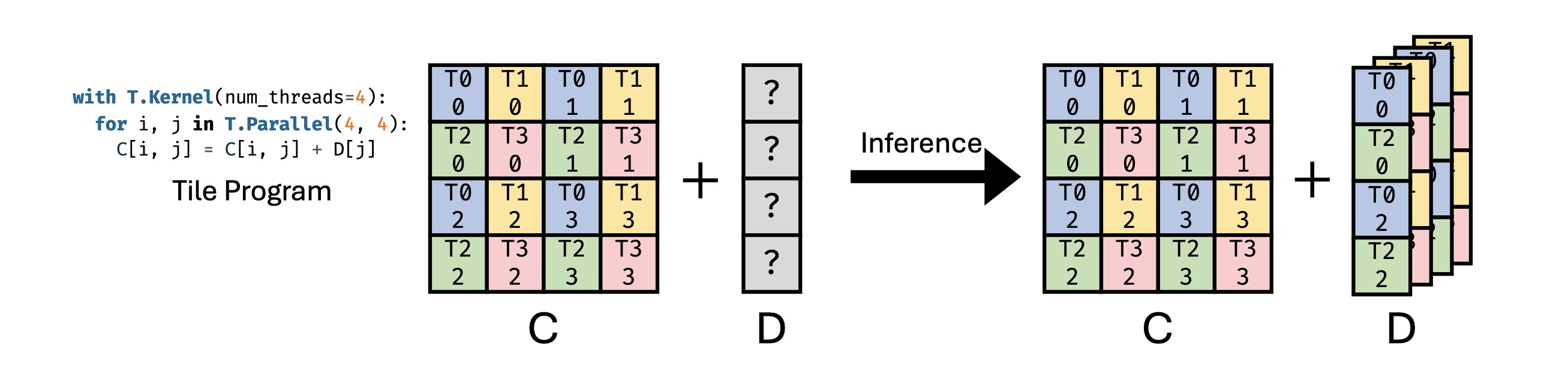 如图7所示,考虑这样一个场景:矩阵C是GEMM操作的结果,对应一个片段对象,并且需要在GEMM计算后加上偏置D。鉴于GEMM在推断过程中具有最高优先级,其线程绑定配置是预先确定的,而D的线程绑定策略仍有待确定。输出矩阵C的维度是4×4,分布在8个线程上,每个线程负责2个元素。因此,偏置缓冲区D的布局必须与此配置对齐。由于张量C的每一行由2个线程处理,两个线程在执行加法操作时都需要访问D中相同的元素。因此,必须对D进行复制,以确保每个线程都能访问到相应的元素。可以使用相同的方法推断出D的布局。