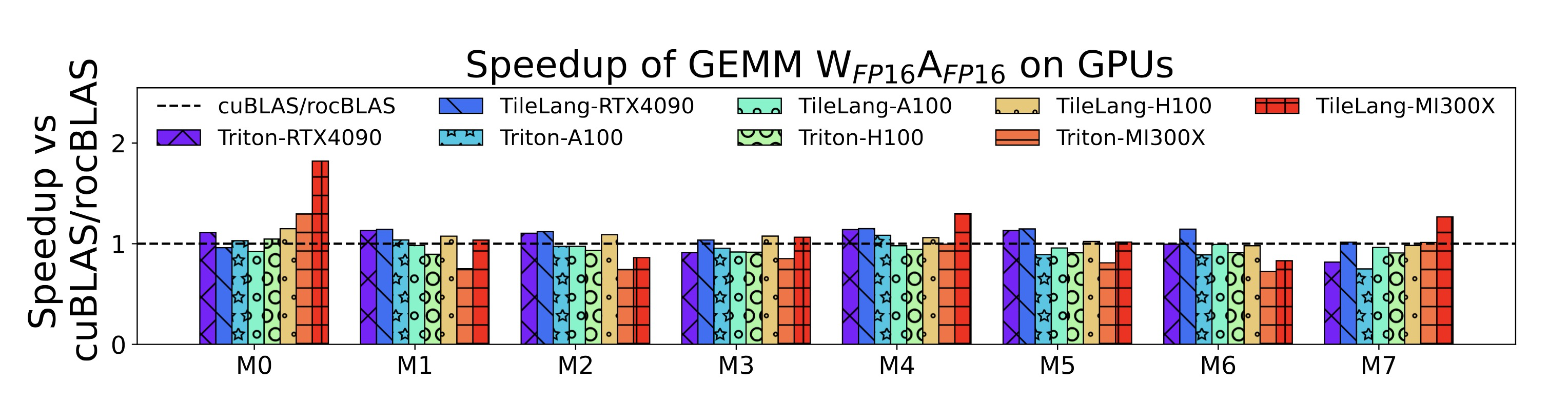 硬件平台。我们在NVIDIA和AMD GPU上评估TileLang,因为它们是应用最广泛的加速器。我们的实验使用了三款前沿GPU:NVIDIA H100(80 GB)、NVIDIA A100(80 GB)和AMD Instinct MI300X(192 GB)。对于NVIDIA H100,我们使用CUDA 12.4;对于MI300X,我们使用ROCm 6.1.0。所有平台均在Ubuntu 20.04下运行。