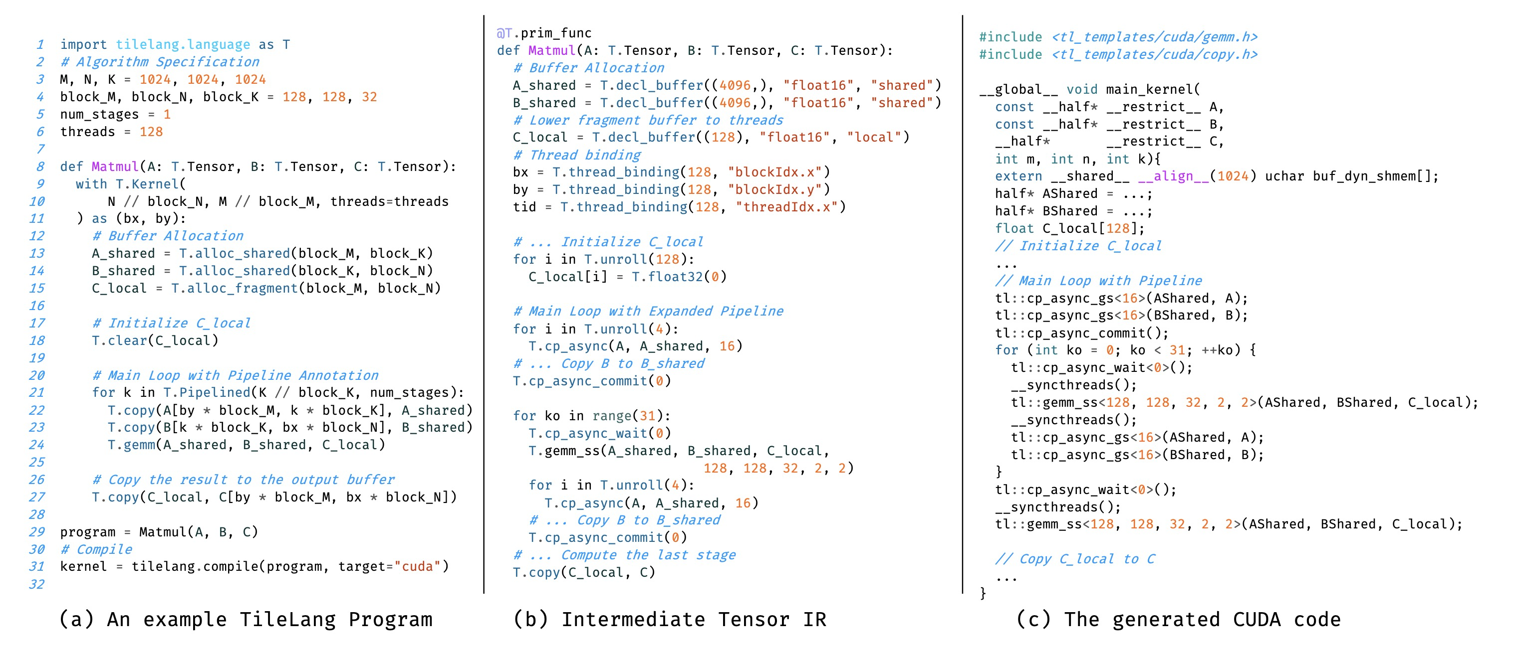 Fig. 1. An example TileLang program and the corresponding lowered ir and generated cuda c code. The code snippets are simplified for demonstration purposes.