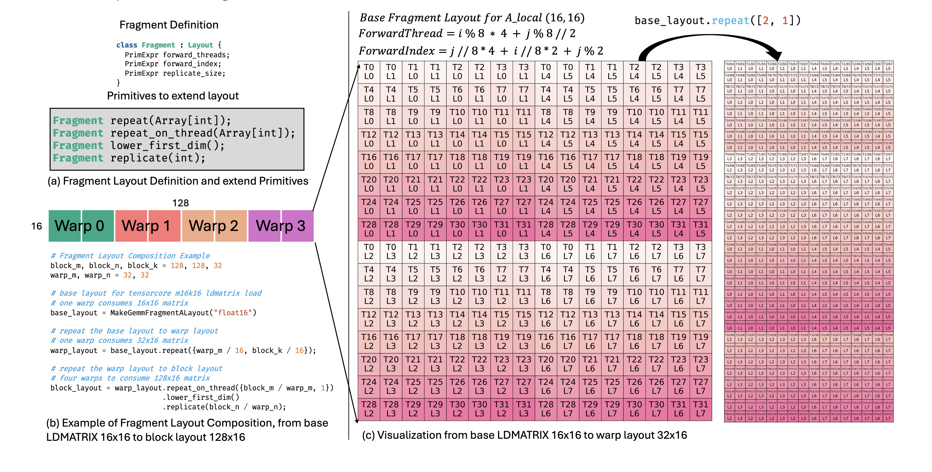 图6(a)展示了片段布局的定义。TileLang提供了四种原语操作来帮助用户扩展现有的片段布局。图6(b)展示了如何使用这些原语,从一个用于m16k16矩阵片段的mma_ldmatrix指令的基本布局,推导出完整的块级布局的示例。其中,base_layout表示单个线程束消费一个m16k16矩阵的布局。通过repeat原语扩展该布局,形成warp_layout,允许单个线程束消费一个m32k16矩阵。图6(c)可视化了这个转换。接着,warp_layout使用repeat_on_thread和replicate等原语进一步扩展,产生block_layout,代表四个线程束共同消费一个m128k16矩阵。