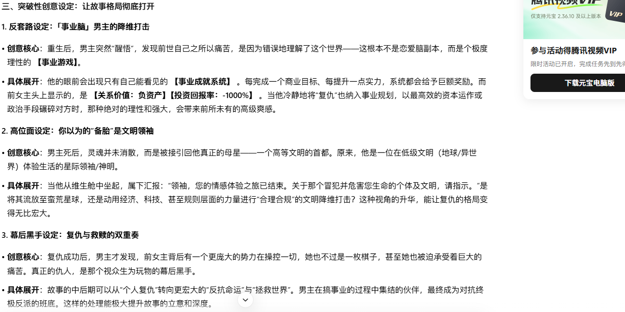 背靠公众号生态,它最大的优势是找资料巨快。我写历史文或者现实题材时,需要查大量背景资料,元宝能直接链接微信全网内容,给出的信息源非常准确。虽然在ai生成小说的创意度上中规中矩,但作为资料库和辅助润色工具,它非常顺手,完全免费这点也很香。
