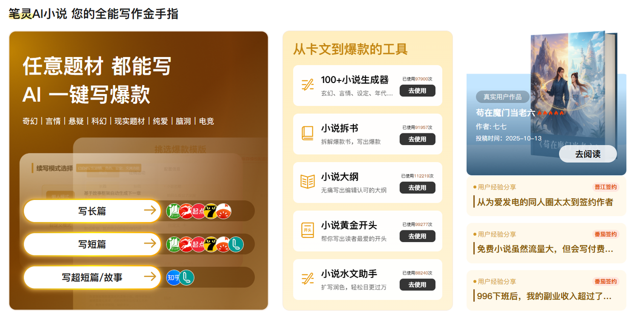 1、如果你是实战派,想签约、想日更、想写长篇: 闭眼冲 笔灵AI。尤其是它的【AI全篇创作】功能,是真的能帮你把故事“圆”回来的,逻辑性和网文节奏感在这些工具里是独一档的存在。