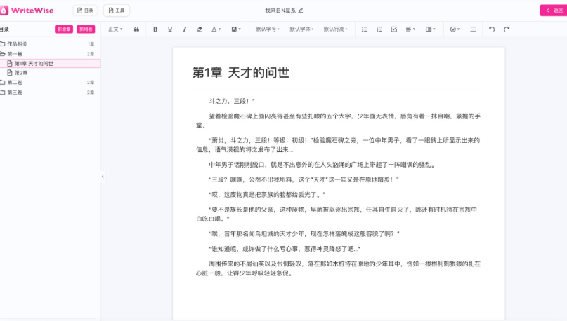 但笔灵给我最大的惊喜在于它的AI全篇创作功能。这功能简直是为长篇网文量身定做的。我试着把一个系统流的开头投喂进去,生成的情节画面有声有色的,比我自己写的生动多了,恨我的脑子怎么想不出来。
