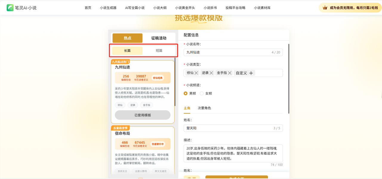 这就属于非常垂类的工具了,专门盯着网文签约这个痛点打。我新手期就是靠它度过的。它的模板化程度非常高,比如你想写“战神归来”,它会一步步引导你填空,然后生成符合市场风向的“黄金三章”。