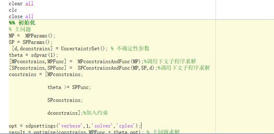 MATLAB代码:基于列约束生成法CCG的两阶段鲁棒问题求解 关键词:两阶段鲁棒 列约束生成法 CCG算法 鲁棒优化 参考文档:《Solving two-stage robust optimization problems using a column-and-constraint generation method》 仿真平台:MATLAB YALMIP+CPLEX 优势:代码注释详实,适合参考学习,非目前烂大街的微网两阶段规划版本,请仔细辨识! 主要内容:代码构建了两阶段鲁棒优化模型,并用文档中的相对简单的算例,进行CCG算法的验证,此篇文献是CCG算法或者列约束生成算法的入门级文献,其经典程度不言而喻,几乎每个搞CCG的两阶段鲁棒的人都绕不过此篇文献,所以萌新们或者新手们赶紧冲起来学习吧! 这段程序主要是一个优化问题的求解过程,涉及到主问题和子问题的求解。下面我将对程序进行详细的解释和分析。 首先,程序的开头使用了一些命令来清除变量、关闭窗口等。然后,定义了一些参数和变量,包括不确定性参数d、主问题参数MP、子问题参数SP、KKT参数和优化器设置opt。 接下来,程序进入主问题求解的过程。主问题的目标是最小化MPFunc + theta,其中MPFunc是一个关于MP.Y和MP.Z的函数,theta是一个变量。主问题的约束包括MPconstrains、theta >= SPFunc、SPconstrains和dconstrains。其中,MPconstrains是一个关于MP.Y和MP.Z的约束,SPFunc是一个关于MP、SP和d的函数,SPconstrains是一个关于SP.X的约束,dconstrains是一个关于d的约束。通过调用优化器,求解主问题,并将结果存储在result中。最后,将MPFunc + theta的值赋给LB。 然后,程序进入子问题求解的过程。子问题的目标是最大化-SPFunc,其中SPFunc是一个关于MP、SP、KKT和d的函数。子问题的约束包括SPconstrains、dconstrains和KKT的约束。通过调用优化器,求解子问题,并将结果存储在result中。最后,将SPFunc的值加上MPFunc的值赋给UB。 接下来,程序进入CCG(Cutting-Plane Generation)迭代过程。在迭代过程中,程序使用while循环,直到UB和LB的差的绝对值小于1e-5为止。在每次迭代中,程序根据当前的UB和LB的值,更新SP的约束和MP的约束。然后,再次求解主问题和子问题,并更新UB和LB的值。迭代次数n加1。 最后,程序定义了几个子函数,包括MPParams、MPconstrainsAndFunc、SPParams、SPConstrainsAndFunc、KKTParams、SPKKT和UncertaintySet。这些子函数分别用于定义和计算主问题和子问题中的参数、约束和目标函数。 综上所述,这段程序主要是一个优化问题的求解过程,通过迭代的方式不断更新UB和LB的值,直到收敛为止。程序涉及到的知识点包括优化理论、线性规划、对偶问题、不确定性建模等。通过对程序的分析和理解,可以了解优化问题的求解过程和相关的数学理论。