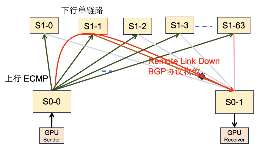 大模型训练期间,成千上万的 GPU 需频繁同步数据,任何链路抖动导致的丢包都会使其他数千个 GPU 必须空转等待,形成“木桶效应”,极大地降低 GPU 利用率,造成算力资源浪费。随着 AI 技术的飞速发展,从 800G 到 1.6T,从万卡到更大规模的算力集群,网络基础设施的演进之路永无止境。然而在实际场景中(如图 6 所示),由于 BGP 路由仍然可达,且传统负载均衡无法感知全局拓扑变化,导致业