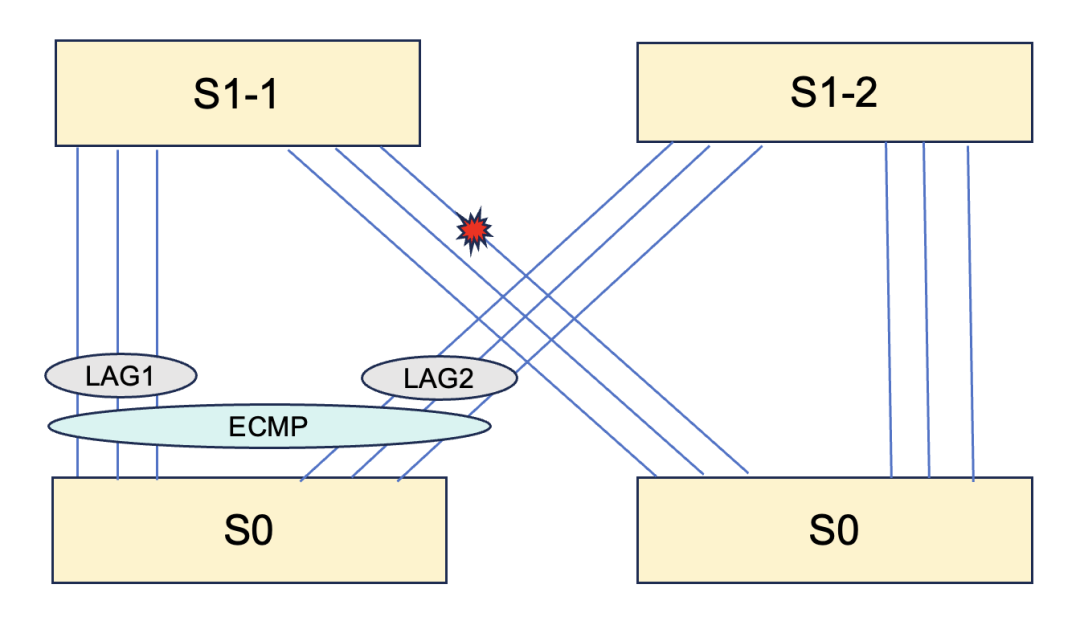 在小规模网络集群中,设备间通常存在多链路互联,带宽具有对称性。如图 5 所示的拓扑,当一条 800G 链路断开时,理想情况下业务带宽也应相应损失 800G。然而在实际场景中(如图 6 所示),由于 BGP 路由仍然可达,且传统负载均衡无法感知全局拓扑变化,导致业务带宽损失被不成比例地放大,损失值可能是物理带宽损失的数倍,最高可达 32 倍。