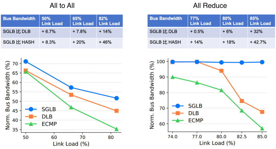 为此,火山引擎与芯片厂商深度合作,联合开发了业界首个可扩展的全局网络负载均衡技术——SGLB(可扩展且稳健的全局负载均衡)。SGLB 基于全局拓扑,能够微秒级感知链路拥塞状态,并计算端到端最优路径。实测性能表明,相较于传统 Hash 选路,GPU 网络带宽可提升 40%。更多技术细节,可参阅 SIGCOMM 2025 的相关论文:https://dl.acm.org/doi/10.1145/3718958.3750527。