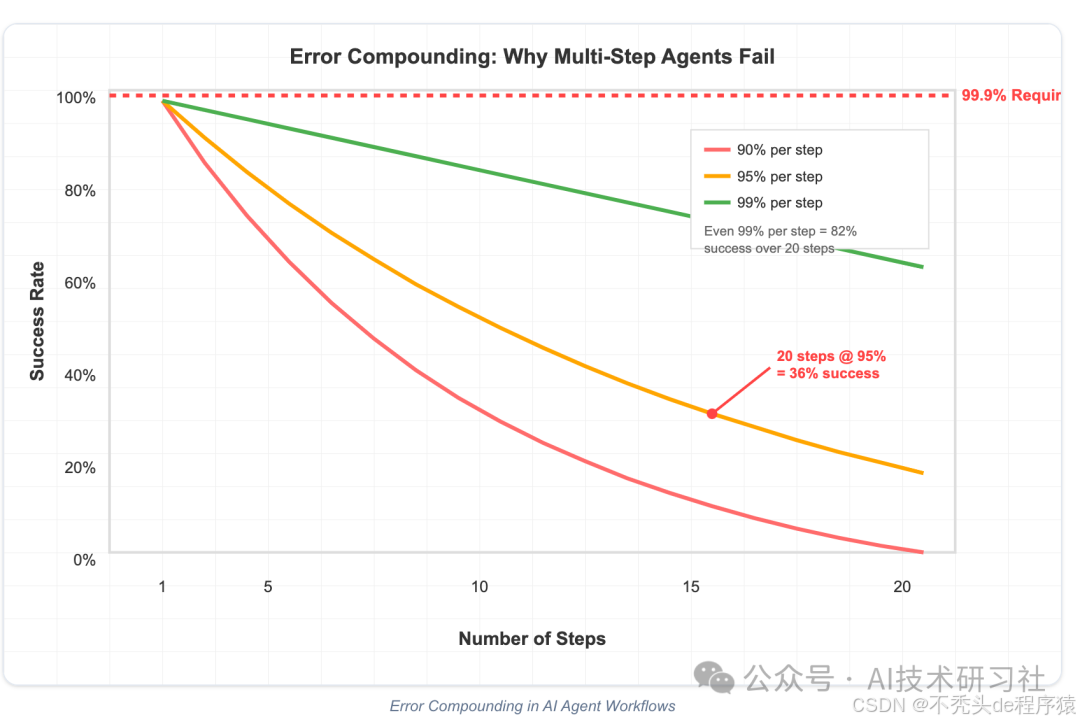 - 错误率叠加问题:如果单步准确率是 95%,经过 20 步后,整体成功率只有 36%。而生产环境要求 99.9% 的稳定性,这中间差了几个数量级。