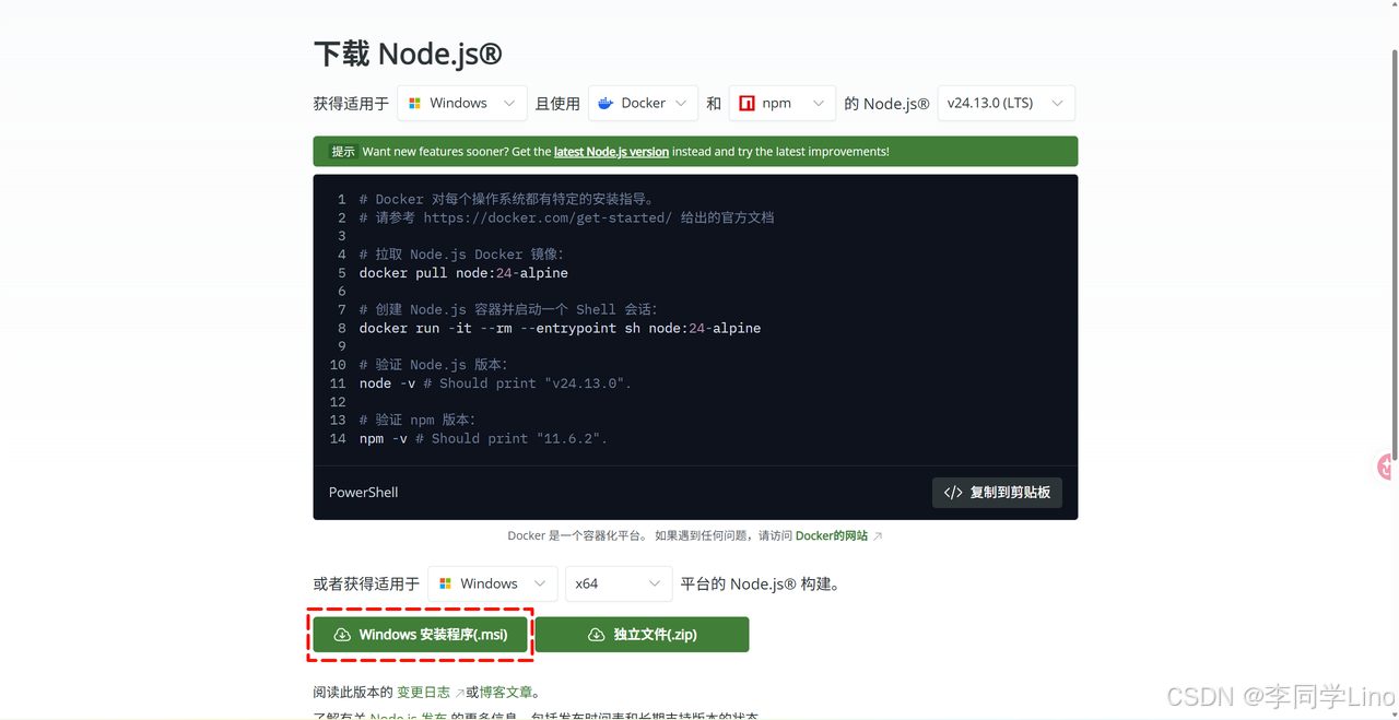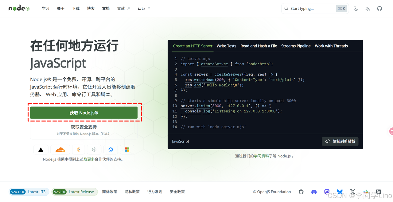 版本选择:推荐下载左侧的 LTS (Long Term Support) 版本。LTS 是长期支持版,最稳定,适合工作和生产环境;右侧的 Current 是尝鲜版,bug 相对较多。