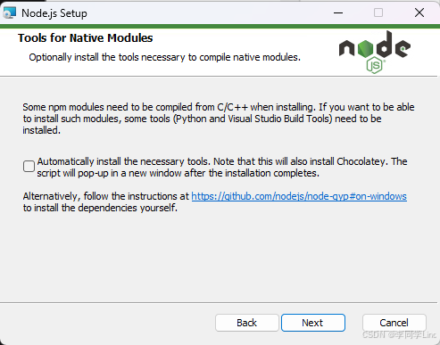 5. Tools for Native Modules:这个界面不要勾选(除非你需要编译 C++ 模块),否则它会给你自动下载几个 G 的 VS Build Tools 和 Python,非常慢。直接点击 Next。