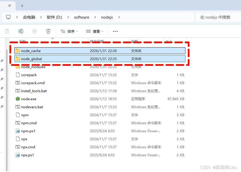 打开你的 Node.js 安装目录(例如 D:\software\nodejs),手动新建两个文件夹: