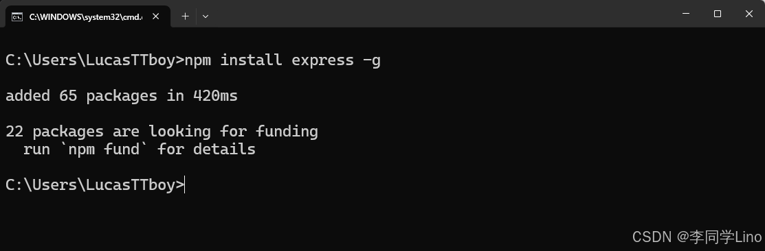 为了确保一切配置完美,我们试着安装一个常用的全局模块(比如 express 或 vue)。