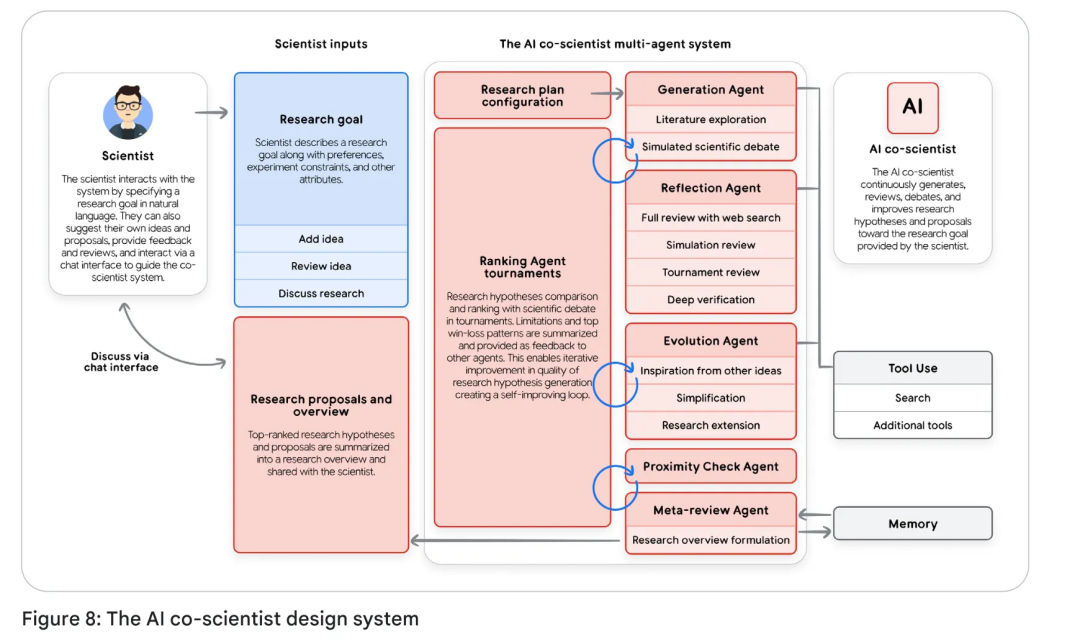 这是一个旨在加速科学发现的虚拟研究协作系统。它通过一个**“监督者”**智能体来协调一个由多个专业智能体组成的团队(如“文献研究智能体”、“数据分析智能体”等),从而将复杂的科学研究过程自动化。研究人员只需定义一个高阶的研究目标,Co-Scientist就能系统性地生成、辩论、验证和迭代大量新颖的科学假设,极大地拓展了人类研究者的探索边界。