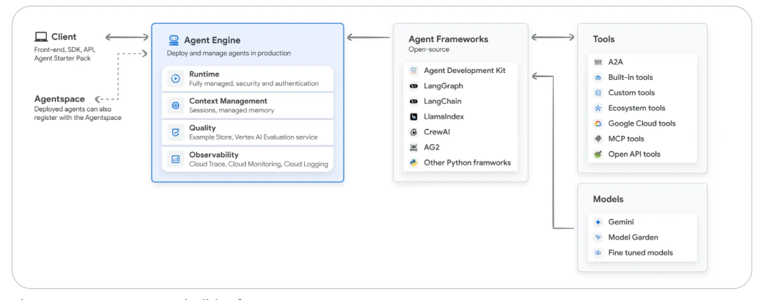 - **部署,运行时服务(身体和腿):**生产部署能提供可靠的服务,并添加用于监控的日志,管理服务的编排,同时提供A2A的访问模式,来扩展其能力边界。