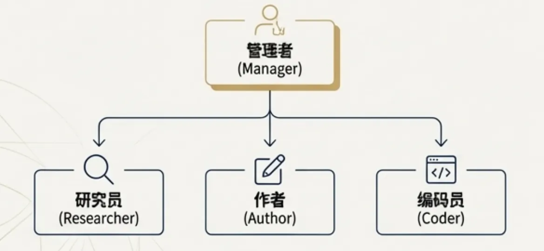 **定义:**在这一层级,我们不再构建一个万能的“超级智能体”,而是构建一个“专家团队”。一个“项目经理”智能体可以将复杂任务分解,并委派给专门的子智能体去执行。