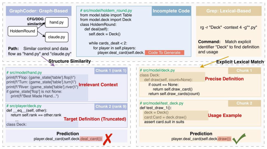 3. 隐式依赖(基本限制):当当前上下文缺乏显式结构关系(如继承)时,Naive GrepRAG 难以使用 ripgrep 命令定位关键上下文。这是词法检索的根本局限。