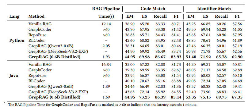 - GrepRAG (0.6B Distilled):1.69-2.05 秒