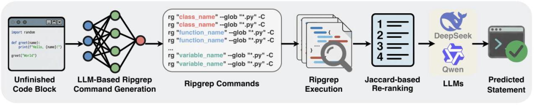 1. Grep 查询生成:给定当前光标位置前的本地上下文,LLM 自主生成 条 ripgrep 命令(通过提示词设为 10 条)。LLM 会分析代码的词法特征、潜在依赖和用户意图来生成查询。