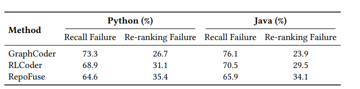 类型 II:重排序失败(占 23.9%-35.4%):基线检索到了核心代码块,但重排序没能把它们排到前面。GraphCoder 强调结构相似性(如相似的循环模式),可能与实际补全目标无关;RLCoder 使用微调检索器编码语义相似性,但往往无法高度排序精确的方法或变量名。
