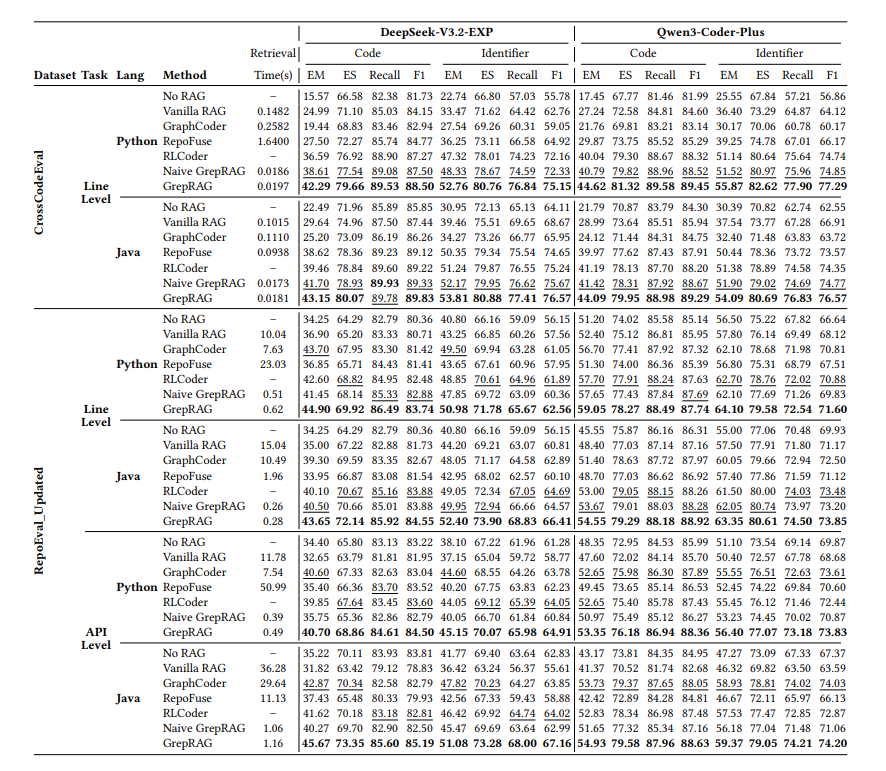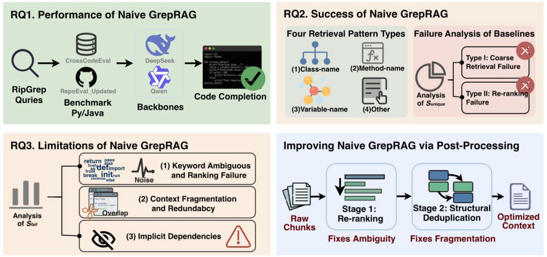 - 提出了优化的 GrepRAG 策略:引入标识符加权重排序和结构感知去重,解决了关键词歧义、上下文冗余和碎片化问题,在多个基准测试上达到了 SOTA 性能。