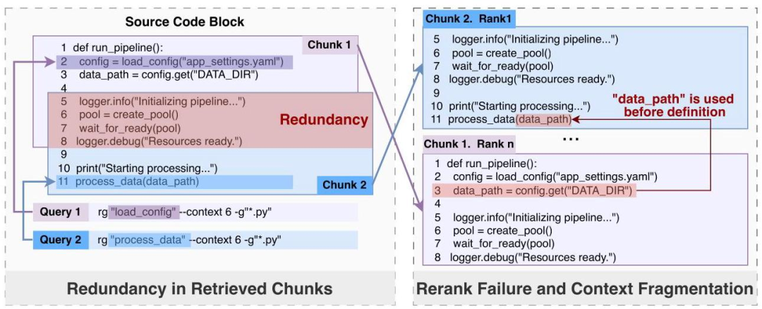 2. 上下文碎片化和冗余(重要问题):即使正确上下文进入 Top-K,其结构组织也存在问题。如图所示,两个独立的 grep 查询(针对 “load_config” 和 “process_data”)分别匹配了同一文件的相邻区域。独立检索机制导致信息冗余(重叠代码区域被重复保留)和语义不连续(使用位置的片段排名高于定义位置,导致"使用在定义之前"的逻辑混乱)。