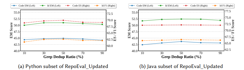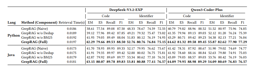 GrepRAG w/o Dedup(仅改用 BM25 重排序):性能提升相对较小,Python DeepSeek-V3.2-EXP 上 EM 仅从 38.61% 升至 39.12%(+0.51%)。这表明在上下文窗口被大量重复代码片段占据时,仅优化排序算法难以突破瓶颈。