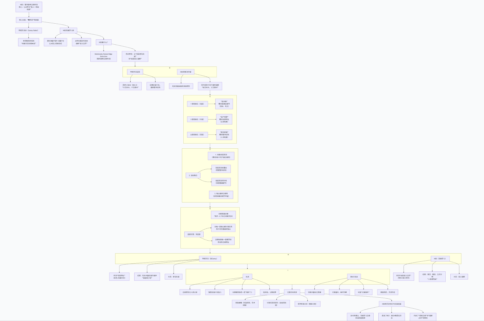 根本性转变:HED的核心不是提出一个新算法,而是开启了一种新范式——从基于手工规则和低层信号处理的“检测”,转向基于数据驱动和高层语义理解的“学习”。这是框图中反复强调的“从信号处理到语义理解”。