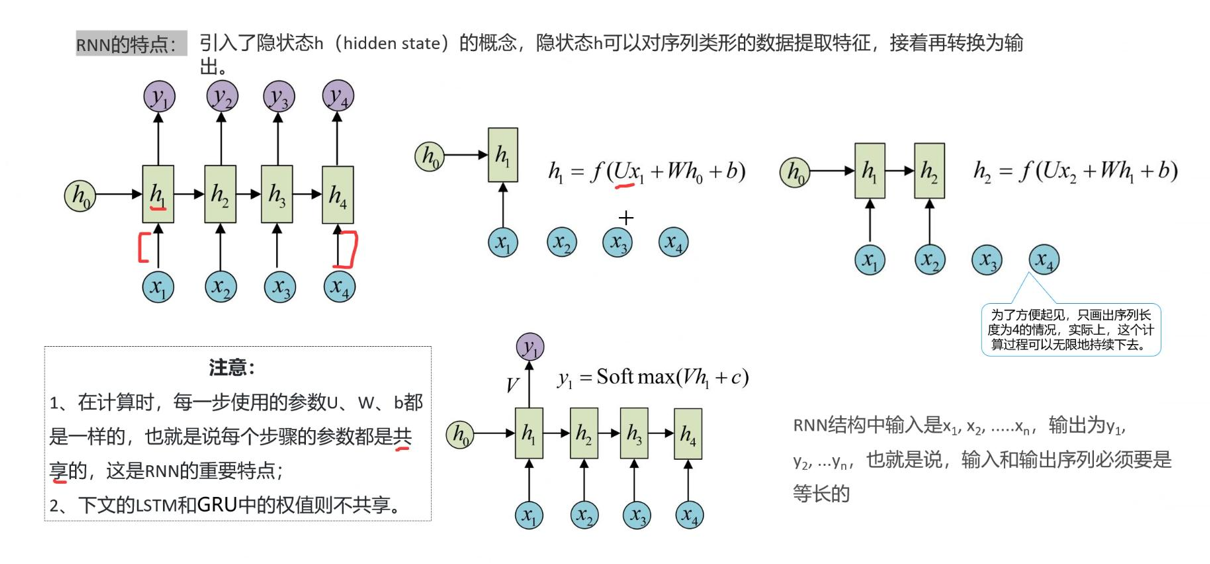 第一张图中还有一个容易被忽略,但极其重要的细节:所有时间步的计算,使用的参数U、W、b都是完全共享的。这也是RNN的核心优势之一。
