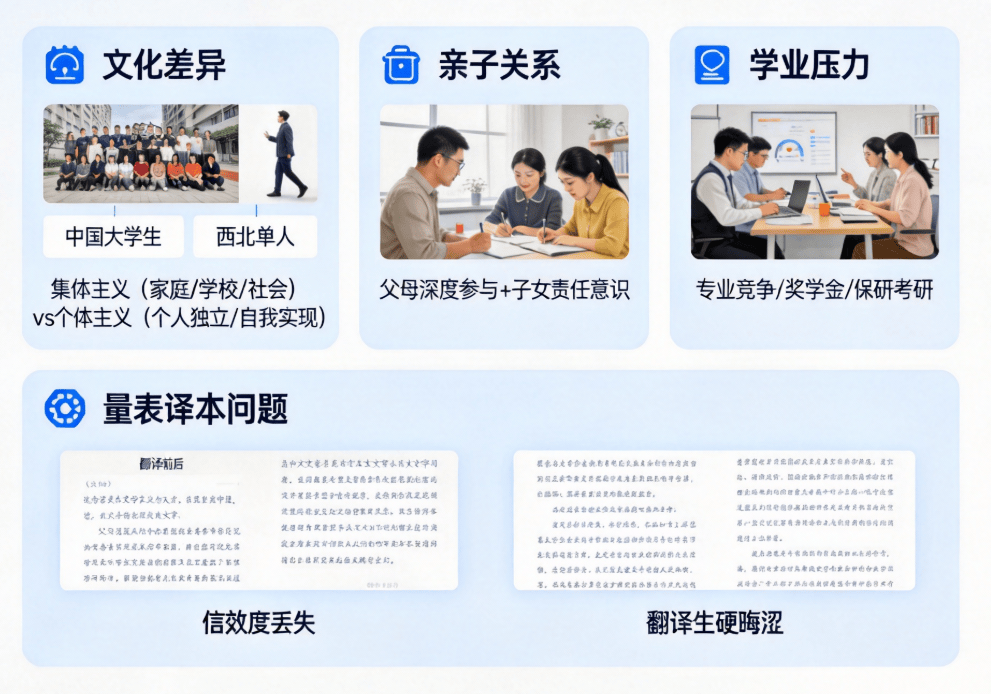 从亲子关系来看,中国家庭亲子间情感纽带深厚,父母对子女学业和生活全方位深度参与,期望颇高 ,子女也将满足父母期望视为重要责任,这种紧密的亲子关系模式在西方量表中缺乏对应考量;在学业压力方面,中国高等教育体系下,大学生面临的专业竞争、奖学金评比、保研考研等压力具有独特性,西方量表难以精准捕捉这些压力源对中国大学生心理状态的影响。