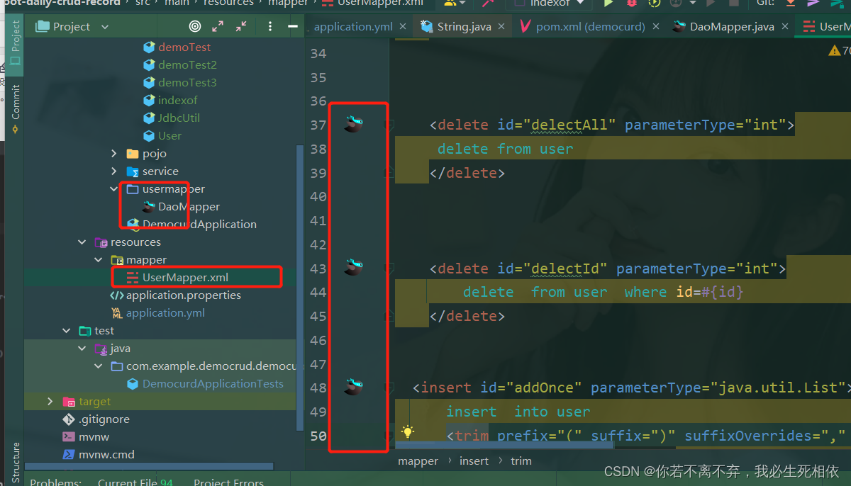 安装完成后我们会发现所有的Mapper接口和mapper.xml文件都变成了MyBatis的小鸟图标。