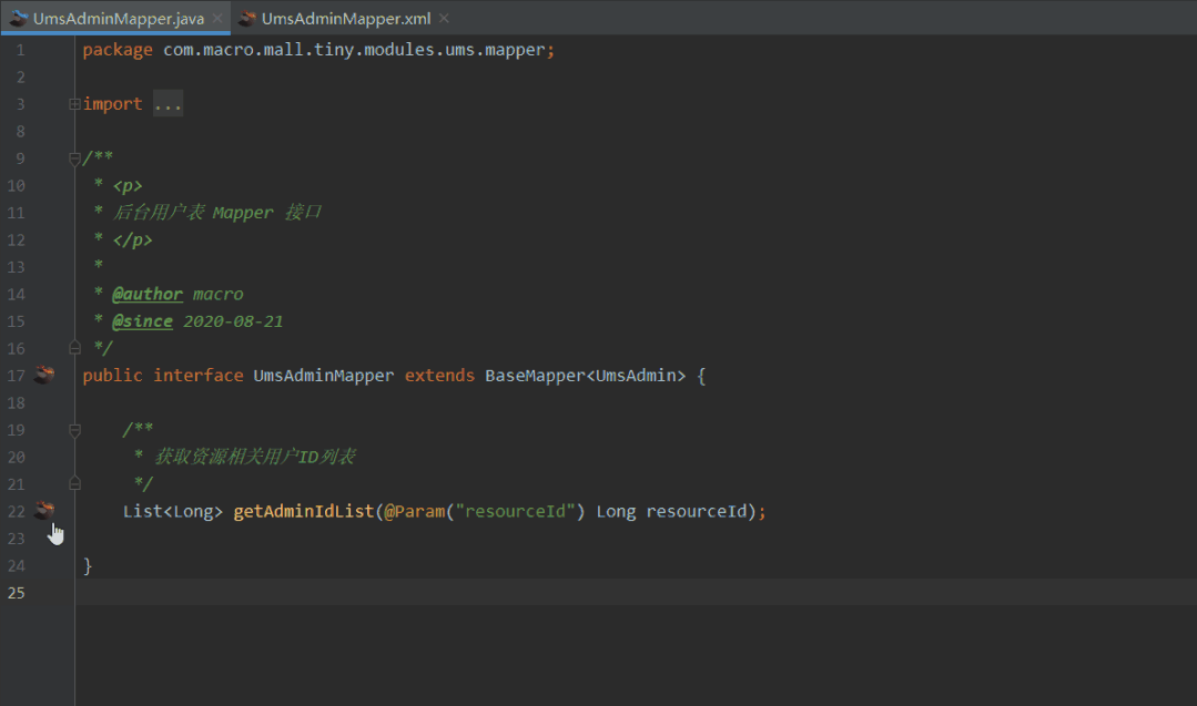 我们点击Mapper接口方法左侧的图标可以直接跳转到mapper.xml对应的SQL实现,在mapper.xml点击左侧图标也可以直接跳转到Mapper接口中对应的方法。 (可以是实现Mapper跳转到对应方法中的功能)