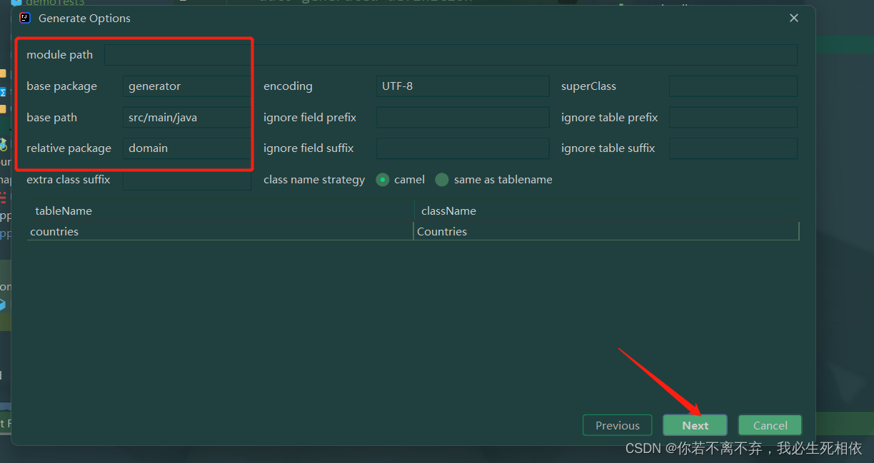 生成的时候可以通过修改选项,比如修改基础包路径、实体类包路径等; 默认是这样的