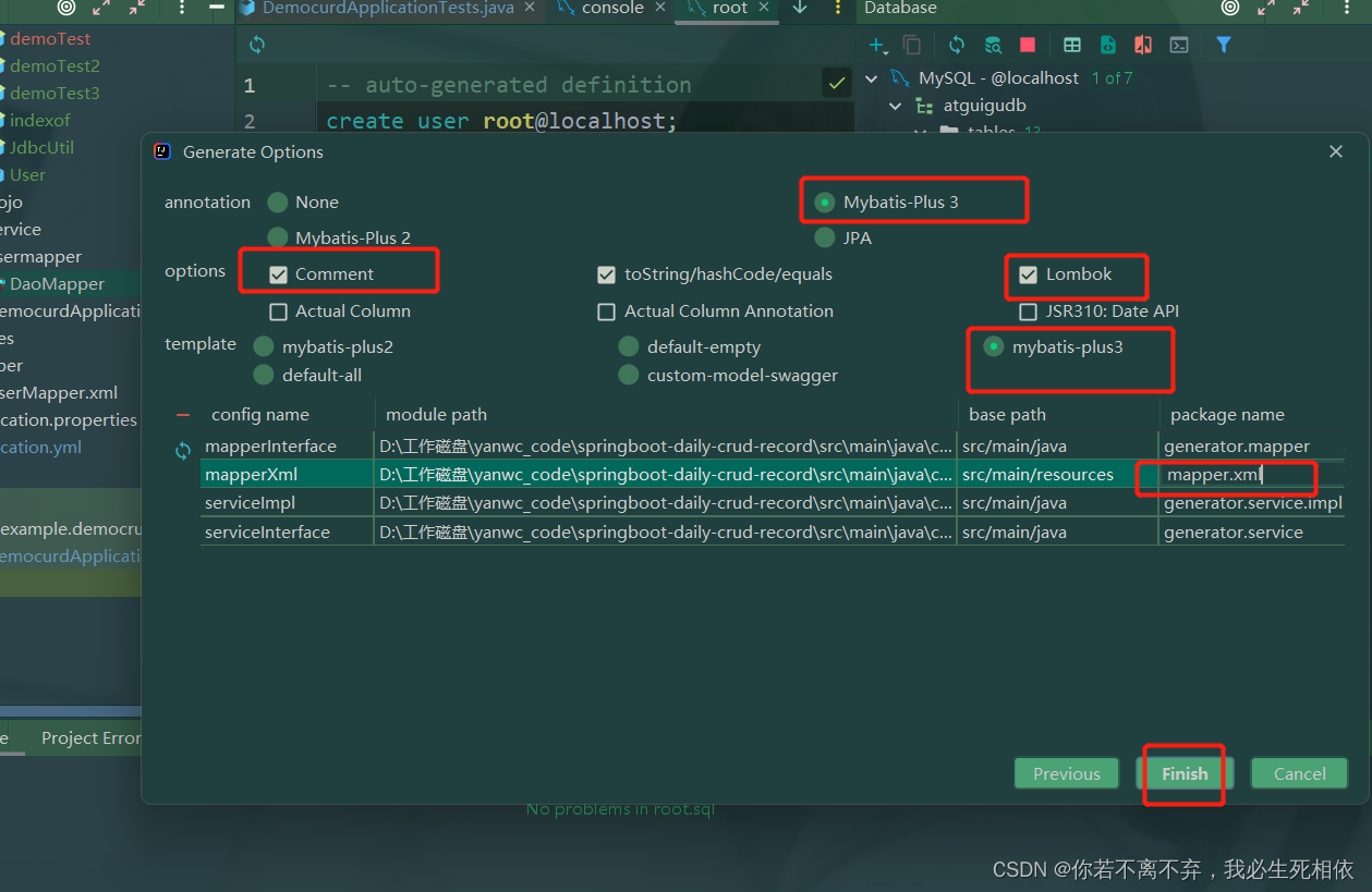 生成时选择注解和模板类型为Mybatis-Plus 3,有需要的话可以勾选Lombok选项以及修改mapper.xml的文件路径;