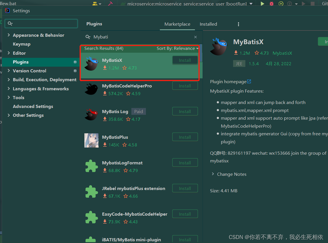 安装 在使用前我们需要在插件市场中搜索并安装MyBatisX插件。