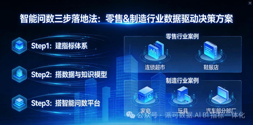 什么是智能问数?智能问数就是让老板、店长、厂长不用学 SQL、不用翻报表,用大白话问数据(比如“今天3家门店哪款牛奶卖得最好”“下周哪款零件订单最多”),系统秒回答案还带图表,让“人人用数据、随时用数据” 落地。下面用零售/制造的真实案例,讲清三步落地法,看完就能上手。